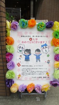 新入生へのエールの看板は、ファボール星陵で介護福祉士として働いている星陵台中学のOGが作成しています。