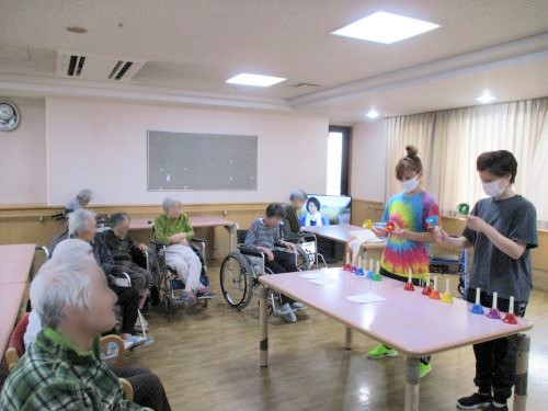 今年は、新型コロナの影響で、いつもの年のような行事やレクリエーションが思うように行えず、ご入居者様にお寂しい思いをさせてしまっています。そんな中、少しでも気をまぎらわせていただこうと、職員は、限られた範囲であれやこれや工夫をしているところなのですが、このささやかなクリスマス会もそのひとつ。何日もかけてコツコツ手作りしたクリスマスデコレーションをフロアに施し、一生懸命練習したハンドベルの演奏を披露しました。