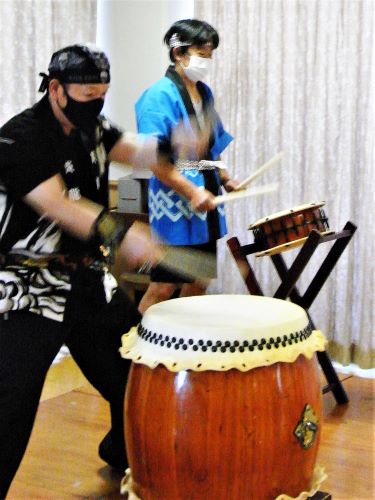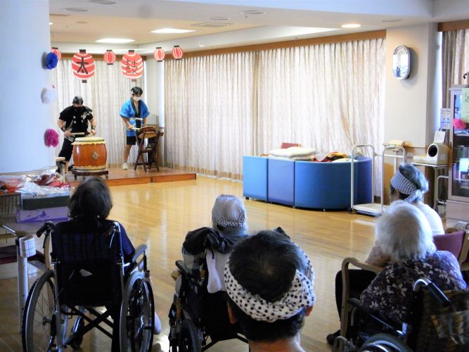 はじめに職員による和太鼓を披露しました。ご利用者の皆さんはとても力強い和太鼓の音色と迫力の演奏に大満足され、「身体に響く太鼓の鼓動がとてもよかったです」とお言葉をいただきました。また、感激して涙を流されているご利用者もおられました。