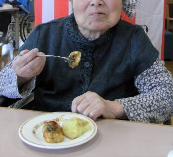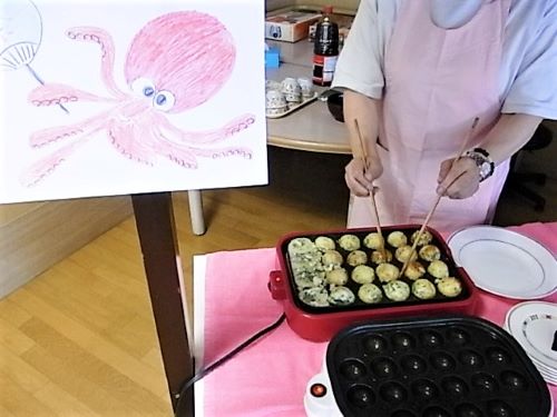 ゲーム終了後は、できたてのほくほく焼き芋とあつあつたこ焼きを召し上がっていただきました。ご利用者から「ゲームを使った本物そっくりのさつま芋をみたら、焼き芋が食べたくなっていたのでとてもうれしいです。」と美味しい笑顔をいただきました。